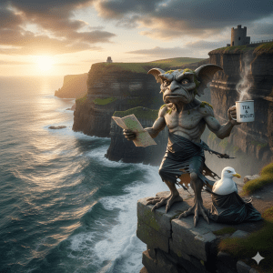 He now resides permanently on the Cliffs of Moher. He is locally famous, known as ‘The Whistling Sentinel of the West.’ He has a new job: official atmospheric sound effect for the Cliffs of Moher. He gets regular compliments, the occasional free picnic sandwich left by tourists, and his only co-worker is Seamus the Puffin, who still demands I move, but mostly just uses me as a very sturdy, slightly grumpy landmark.