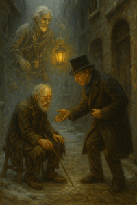 The memory came upon him with merciless clarity. He saw again the counting-house—his own voice, harsh as a closing lock—“A thief you must be, sir, to make such an error!”—the poor man’s protest, the appeal in his eyes, the final hopeless bow as he departed, livelihood broken at a stroke. Marley had thought it nothing then, a necessary severity. Now it rose up like a monument built of his shame.