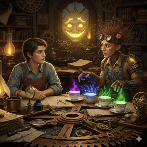 “Well,” said the figure, without looking up, “late, late, and here we are anyway. Care for a tea party?” The Tinker gestured to a series of teacups, each one humming with a different, strange energy.