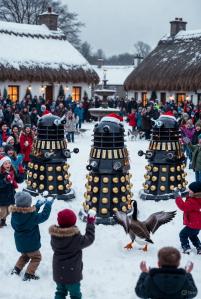 Day 12 – Twelve Drummers Drumming Christmas Eve. The Daleks, battered, leaking, one still wearing a goose feathers like a Hawaiian skirt, rolled to the top of the hill for one last stand. Zeg raised his gunstick: “On the twelfth day of Christmas the Daleks give to you… TOTAL OBLITERATION!” Snow started falling. The village kids pelted them with snowballs. One perfect snowball hit Zeg’s power cell. He short-circuited, lights flashing like a disco, and began singing “Jingle Bells” in a helium voice. Zog and Zag joined in, completely against their will. The entire village gathered, phones out, singing along while three mortified Daleks performed an involuntary Christmas concert on the hillside.