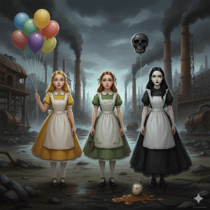 The third Alice rose last, with a slow, deliberate grace. Her dress was inky black lace and deep velvet, her apron a stark, almost spectral white. Her hair, now dark as a raven’s wing, framed eyes that held a knowing, weary glint. A single, skull-shaped balloon, as black as midnight, tethered to her slender wrist, swayed gently above her. She looked at the oily shore, the grey mist, and the other two Alices, and a faint, sardonic smile touched her lips. “Ah,” she murmured, her voice a low, resonant whisper. “So this is the true nature of reality. A crumbling facade, revealing the beautiful despair beneath. How… utterly predictable.” This was Goth Alice, embracing the inherent bleakness with a profound, almost artistic melancholy.