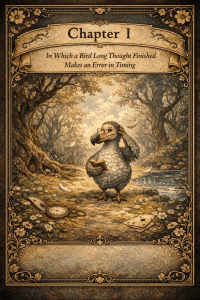 The Dodo’s name (though he rarely used it aloud, having found that names caused expectations) was Professor Archibald Plume. He had once been a Dodo in the ordinary sense: a stout, sensible bird with a talent for walking as if one were late. Then he had been a Dodo in the historical sense: a symbol, a moral, a cautionary tale, and finally a blank space labelled Extinct.