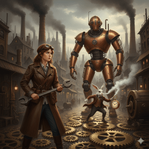 The clang of Alice’s wrench still echoed in the industrial garden. She stepped back as the defeated Clockwork Enforcer settled into a heap of sparking wires and shattered brass.