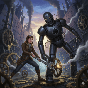 Before Alice could retort, a mechanical screech split the smog. A formation of the Queen of Hearts’ Card Soldiers, now six-foot-tall, articulated Clockwork Enforcers of stamped iron, marched around a hedge. Their faces were painted playing cards—Ace of Spades—and their arms ended in heavy, intimidating piston-driven clubs.