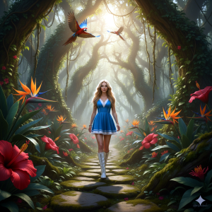 The scent of exotic blooms, heavy and sweet, mingled with the earthy aroma of damp soil. Iridescent macaws soared above, flashes of sapphire and scarlet, between ancient trees draped with lianas. Alice’s boots, long and soft white leather, made soft, rhythmic thuds on the ancient stones. She wore her familiar blue and white mini-dress, her necessary uniform for these delicate, illogical border crossings.