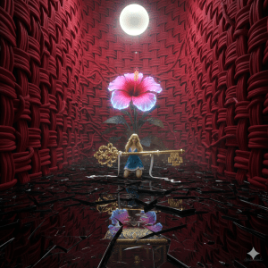 A section of the scarlet liana wall ahead melted back to reveal a crystalline, perfectly clear chamber. In the center, suspended over a pool of utterly still, reflecting water, was the temptation: an immense, glowing hibiscus. Beneath it, floating half-submerged in the reflecting pool, was a small, golden key.