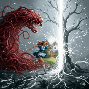 “I am an expert in the externality of illogical systems,” Alice stated simply. “The event was triggered by the Locket I carried—an anchor of stable reality—returning from a domain where the very act of growing up was considered an existential threat. The Serpent that governed that world fought reality by twisting the mind. Now that twisting is bleeding out here.”