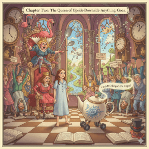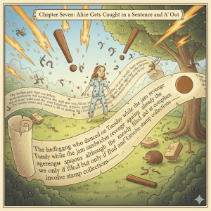 Just when Alice thought she couldn’t possibly experience any more lunacy, she fell upward into a sideways rainstorm, landed on a trampoline made of forgotten socks, and bounced into a jar of marmalade dreams.