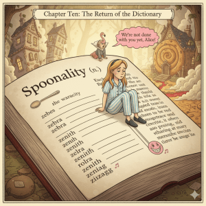 Alice landed with a bump, smack in the middle of her old dictionary—this time, on the page for “Spoonality” (n. the personality traits of spoons).