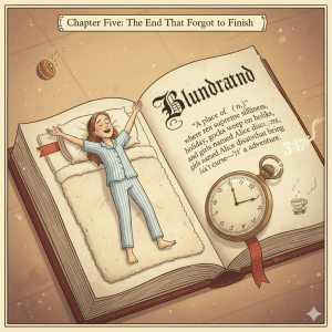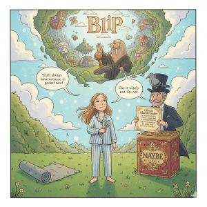 Just then, the clouds overhead parted—revealing a final glimpse of the Blip: upside-down islands, floating tea shops, and a walrus in judicial robes waving goodbye with a rubber stamp.