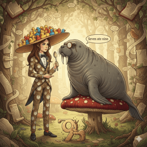 She strolled into a forest made entirely of ideas—trees whispered riddles, and the leaves rustled with opinions. There, sitting on a velvet toadstool and wearing a monocle carved from an old ham, was the Whispering Walrus.