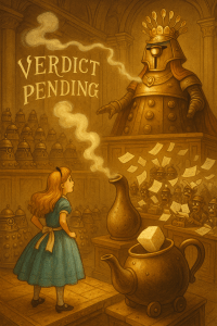 After a while (or possibly a before), she arrived at a crossroads with a revolving sign. “THIS WAY TO THE RABBIT,” it said helpfully, then spun itself and added, “OR POSSIBLY THAT,” then spun again and confessed, “WE ARE UNDECIDED.” The floor vibrated as if a very nervous kettle were stamping one foot. Far below, something called out, “Inspection! Inspection! All rationales to the fore!”