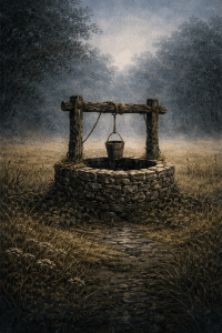 It is lined with heavy stones worn smooth by time, and a ring of moss grows around its edge like a collar that cannot be removed. The water inside looks black, even on the brightest day.