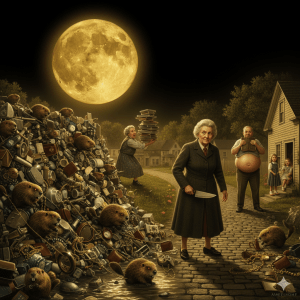 First, it was the beavers themselves, their usual dam-building activities becoming unnervingly frantic in the river that snaked through Bushmantle. Elias saw them, but they weren’t building with sticks and mud anymore. They were dragging stolen heirlooms, antique silverware, and anything that glittered under the unnatural light—into the colossal, impossible dam they were building near the old mill. They had an insane gleam in their tiny black eyes, their chattering a high, desperate frequency. The structure was a towering, grotesque monument of scavenged wealth and junk, rising obscenely from the water, all to block a river that didn’t need blocking.