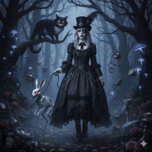 (Verse 1 – Alice) One fine upside-down morning, the sky was askew, A rabbit hole landing, not into, but through. My dress was impeccable (A dreadful, bad sign!), I plopped in a pumpkin patch smelling of brine. “Where am I now?” I asked the soft breeze, It turned to a novel and flew through the trees. Then POP! like sarcasm, a loud, sassy sound, A new brand of chaos just dropped on the ground.