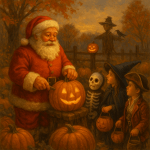 Before Santa could argue further, a crow on the scarecrow’s hat gave a loud caw. The sky darkened. The wind blew harder, scattering leaves into wild dances. The pumpkins themselves seemed to chuckle, deep and earthy.
