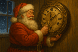 On one frosty morning, just after a particularly exhausting Christmas (the year of the exploding pogo sticks, if you recall), Santa leaned upon the clock and gave it a friendly wind, as one might do to a reluctant grandfather clock.