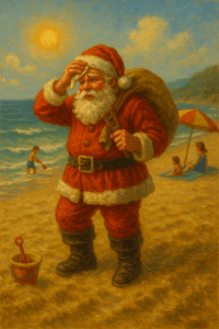 Above him lounged a sky of the laziest blue, as if it had quite given up on weather and taken to daydreaming instead. The sun beamed like a particularly boastful jam tart. A salty breeze tugged at Santa’s hat, which, being a winter hat by education and profession, had never learned the proper manners for July.