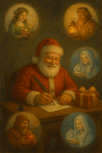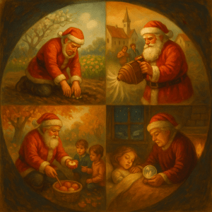Before Santa could say “plum pudding,” the workshop, the elves, and even the snow outside dissolved into a blur of colours, and Santa was tumbled head over boots into another time entirely.