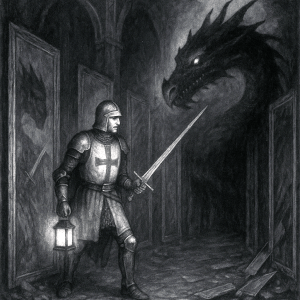 In the nearest mirror he watched himself arrive. The lantern showed him. A man in iron with dust at the knees of his cuisses. The red cross on his surcoat faded by weather and war. The face beneath the open helm burned dark by sun and pale around the eyes where sleep had kept its cost. He had imagined this encounter many times. He had pictured a beast. He had trained his horse to hold steady when the world shook. Yet no dragon waited for him on the floor. The dragon waited in the glass.