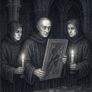 They set it in a frame and kept it as a curiosity. At first it showed nothing but the pale reflections of cloisters and passing clouds. But on certain nights, when the moon was thin and the bell tolled late, those who dared to look swore they saw a knight in iron walking down a hall of shattered mirrors.