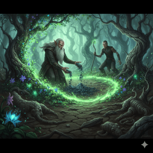 Leaving his mine to the care of a trusted few glowing mosses, Fle began a rare journey back into the world. He traveled to the heart of the Whispering Woods, a place of twisted, gnarled trees and silent, petrified animals frozen in mid-flight. He found Malakor in a clearing, a gaunt, angry man weaving a new petrification spell.