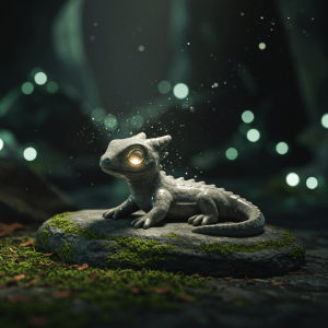 His solitude was broken by a frantic knock on the mine’s sealed stone door. Fle grumbled, his ancient joints aching as he made his way to the entrance. He unsealed the door to find a young human enchanter, out of breath and holding a small, polished stone statue of a lizard. It was a dragonling, frozen mid-leap, its scales glinting with a soft, grey light.