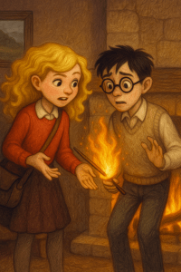 Before she could snatch it back, a gout of flame whooshed from the wand’s tip, and Mr Privet yelped, thrusting it out the open window. “Yes, Harry, thank you, a hand would be lovely. These atmospheric disturbances!”