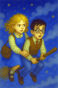 Harry stepped on with the expression of a cat approaching a bath. “Buckle up,” Mr Privet crowed, and the carpet shot skyward.