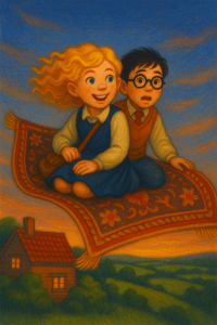 But he was already unrolling it on the lawn. “Come on, Harry. You won’t believe this.” He patted the weave and sat cross-legged. “Hop on. Or shall Box have all the fun?”