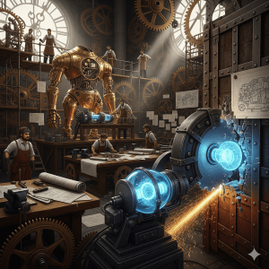 The pneumatic lift shuddered and hissed, a cage of woven brass and copper that plunged them into the clock tower’s labyrinthine heart. The city’s twilight glow was replaced by the dim, flickering light of gas lamps and the rhythmic ticking of a thousand gears, each the size of a carriage wheel. They emerged onto a catwalk suspended above a sprawling workshop, the air thick with the smell of machine oil and ozone.