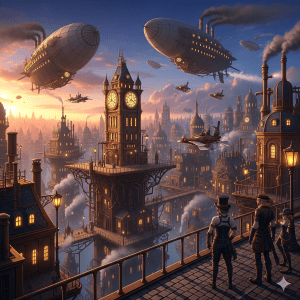 The brass gears of the Great Clock Tower chimed six, echoing through the perpetually twilight streets of Aethelburg. From their vantage point on the upper promenade, Elias and Ada watched as the city stirred below, a magnificent sprawl of cogs, steam, and industry. Airships, the grand leviathans of the skies, drifted silently, their polished hulls reflecting the warm glow of the setting sun and the myriad gas lamps that flickered to life across the metropolis. Smaller gyrocopters zipped between the colossal buildings, delivering packages and ferrying the city’s elite.