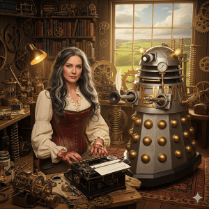 “Identify,” a synthesized voice boomed, though it sounded more like a startled goose than a cosmic menace. “I am Dalek Unit 782, designated to observe the writer known as Freda and her… unauthorized use of dalek lore.”