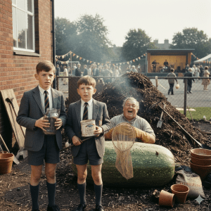 “Now!” Tony hissed, tugging at Gerard’s sleeve. They ducked behind trestle tables and headed towards the forbidden land. As they neared the compost heap, a low rumbling sound echoed from within. Gerard’s eyes widened. “That’s it, Tony! That’s the dragon’s stomach rumbling!”