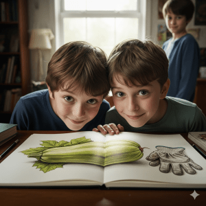Gerard slowly opened the notebook. Inside were drawings of incredible detail. A perfect drawing of the school library, but with a staircase where there wasn’t one. A flawless sketch of the Headmaster, but with a different tie on. And then, they found it. A perfect, detailed drawing of a magnificent, prize-winning marrow, a pair of oversized gloves next to it. They had seen this image before. It was Old Man Henderson’s marrow from the fete. But it was drawn with a precision that was almost supernatural.