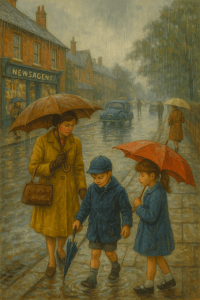 Rain had its own smell — a mix of damp pavements, wet earth, and washing hastily dragged off the line. You could hear it too: the soft hiss on leaves, the drip-drip from gutters, the occasional gurgle as the drains struggled under the weight of it all. From inside, it made the world feel smaller, more secret.