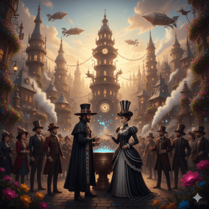 The Grand Exposition was now in full swing. Steam-powered calliopes blasted cheerful, if slightly mechanical, tunes. Inventors passionately demonstrated their elaborate contraptions: a self-stirring teacup, a multi-legged brass automaton designed to fetch slippers, and a dazzling, gravity-defying ornithopter model that hovered over the main stage. The air was thick with the scent of sugar-spun confections and burning coal.