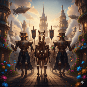 From the shadow of a gargantuan, automated clock tower—the very centerpiece of Gearhart Wonderland—marched the Queen’s royal guard. These were no ordinary soldiers; they were the Cogwork Chessmen, towering automatons of polished brass and blackened iron, each built to resemble a piece from a colossal chess set. Their movements were precise and unsettling, the rhythmic crunch of their metallic feet on the cobblestones announcing their presence.