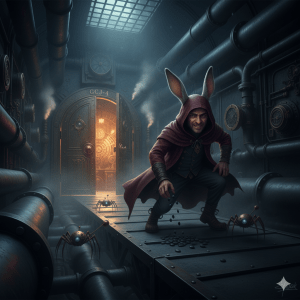 The moment the new piece was seated, the colossal gears beneath them stuttered, and a faint, orange glow pulsed from the chamber. The saboteur, the Clockwork Rabbit, looked up, his masked head cocked as if listening to the effect of his handiwork. He had introduced the flaw, and now he had his proof of concept. He turned to leave, moving with an unsettling blend of agility and mechanical grace, heading toward a small, unmarked air duct—a perfect, clandestine escape route.